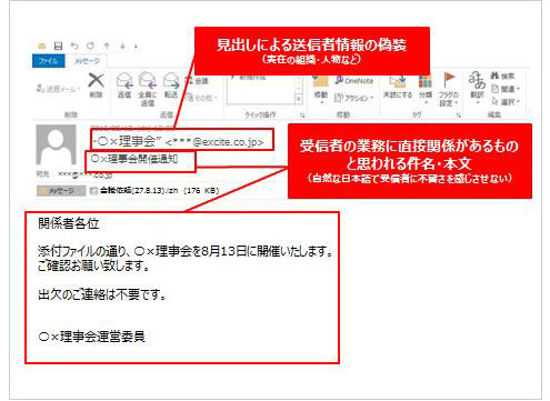サイバー犯罪者は、従業員にメールの添付ファイルを開かせるためにさまざまな工夫を凝らします。その1つが、実在する部署や人物、取引先などを装って通常の業務メールに見せかけることです。受信者に不信感を抱かせぬよう、もっともらしい件名や本文、署名を記述し、議事録や内部資料などに見せかけた添付ファイルを開かせようとします。