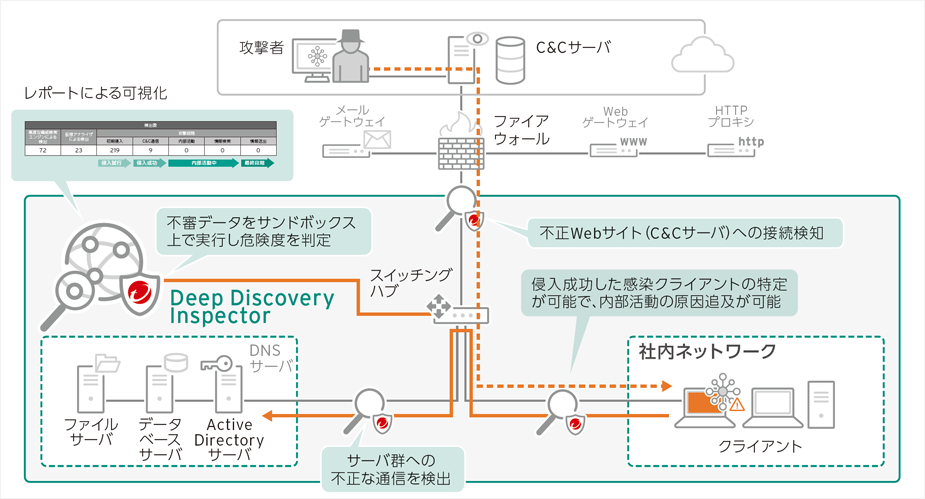 Deep DiscoveryTM Inspectorは、気付くことが難しい標的型攻撃やゼロデイ攻撃をネットワーク上の振る舞いから見つけ出し、早期に対処し被害の深刻化を防ぐための対策製品です。攻撃の初期段階から内部の拡散、外部への通信に至るあらゆる攻撃フェーズにおいて、不正なファイルや通信の検知に加え、管理ツールを悪用した攻撃まで発見します。Deep DiscoveryTM InspectorはC&Cの通信をブロックするばかりでなく、他のトレンドマイクロ製品で利用可能なシグネチャを自動生成し、端末上での対処を可能にします。また、他社のネットワークセキュリティ製品との連携によるネットワークの境界防御も可能です。